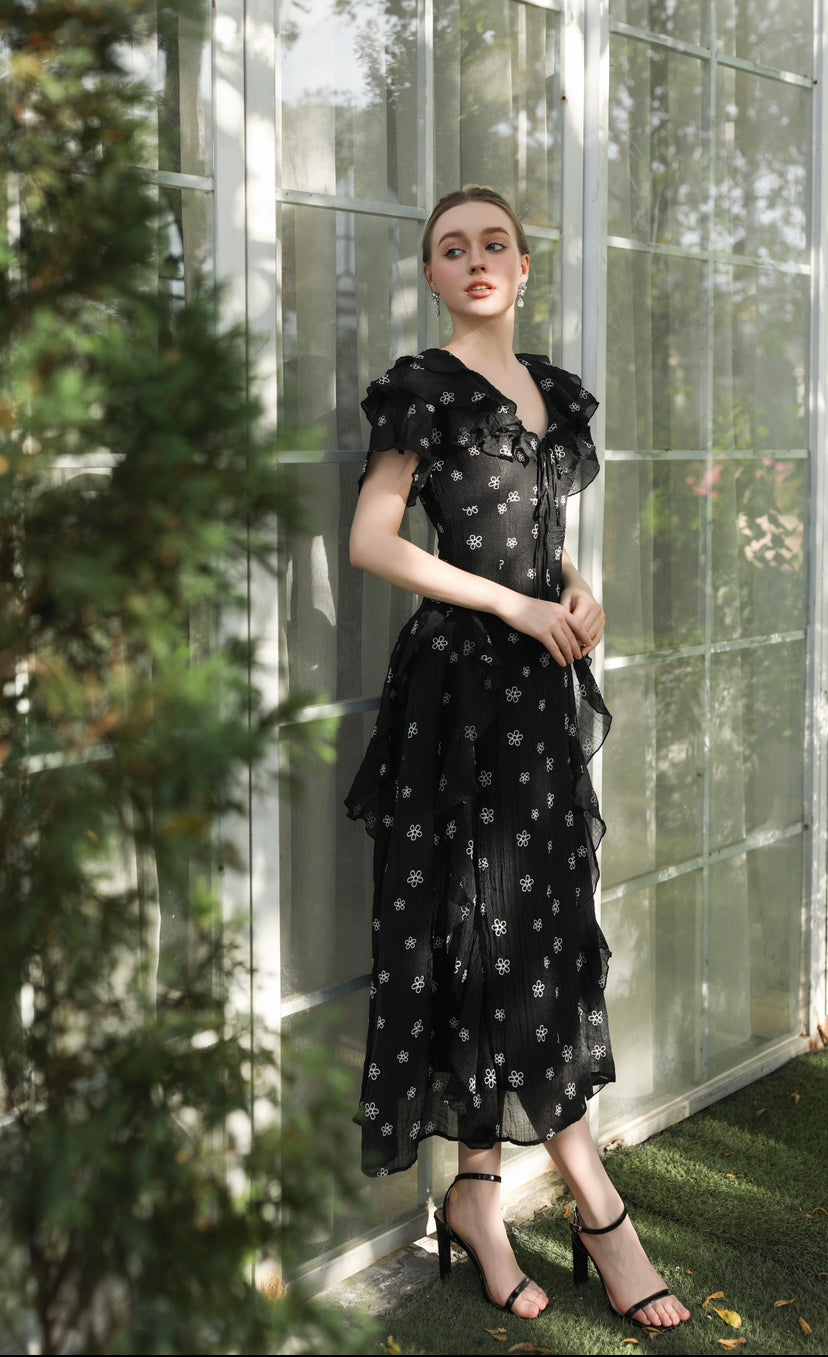 Devon - black floral midi dress